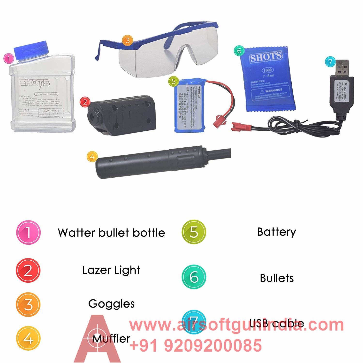 A PUBG theme automatic pistol gun, a silencer, safety glasses, a rechargeable battery, a USB cable battery charger, water balls.