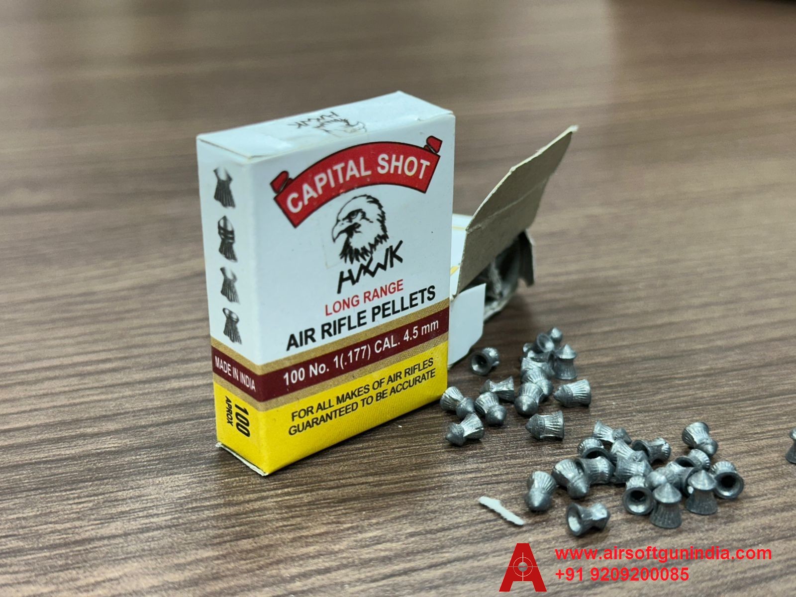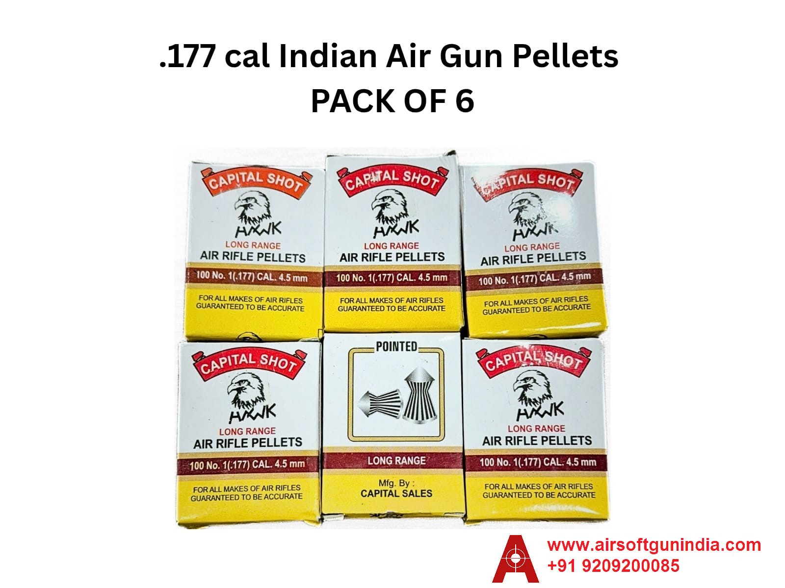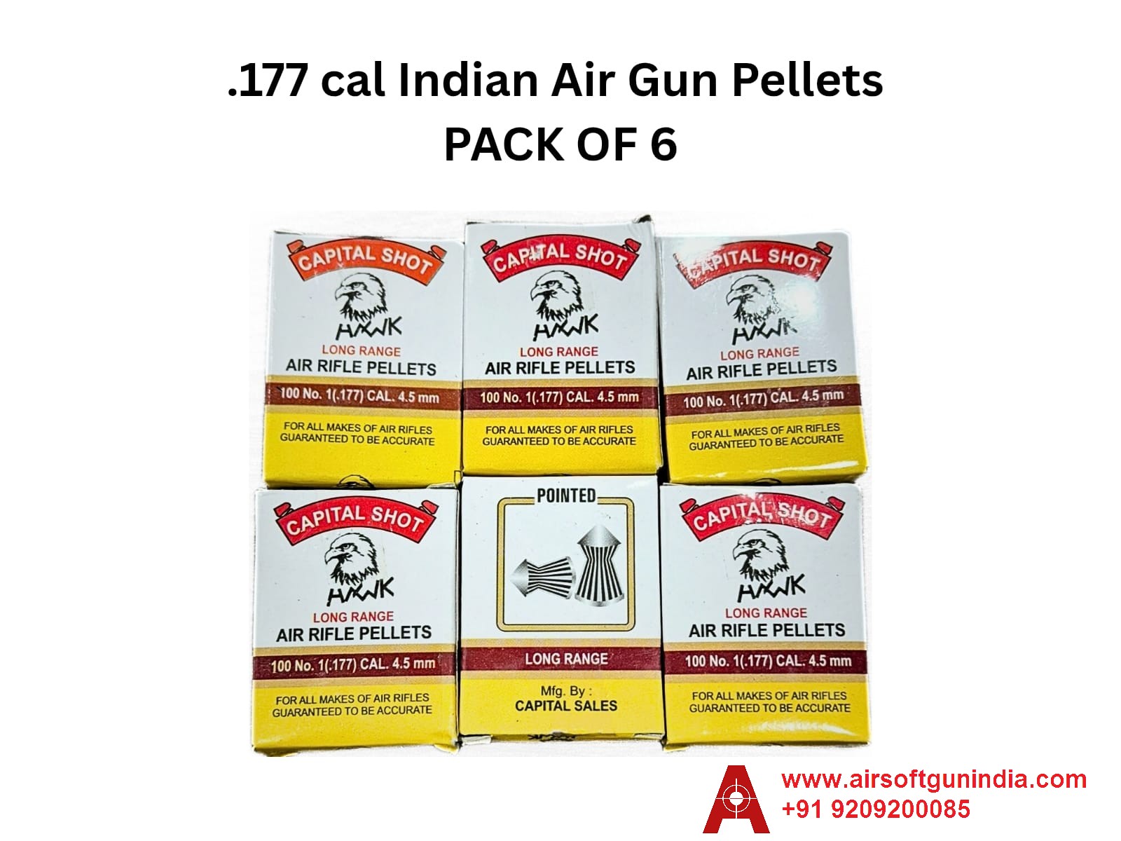 ✅ Capital Shot Hawk .177cal (4.5mm) pellets – Pack of 6 (600 pcs total), perfect for single-shot Indian air pistols & rifles. Ideal for target shooting and training. No license required – ID proof mandatory.